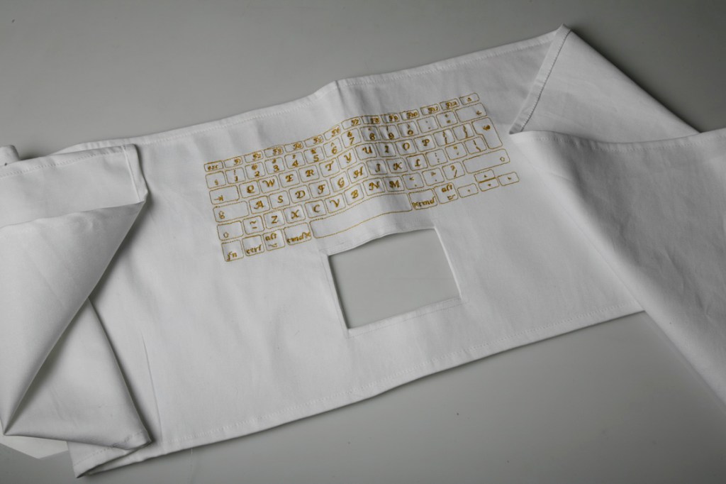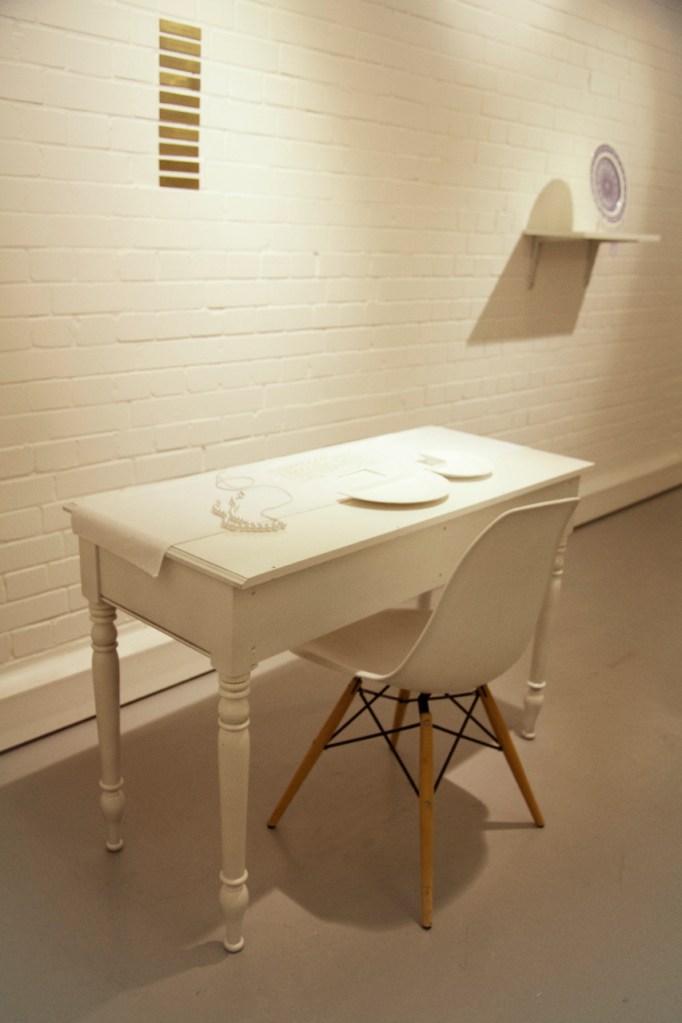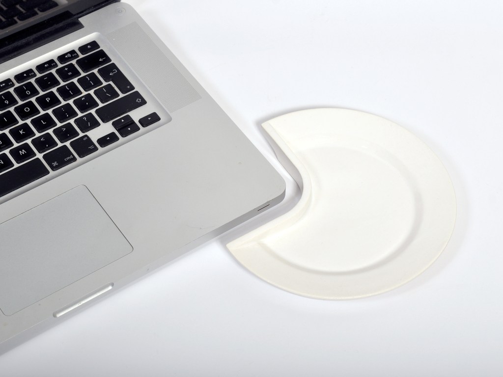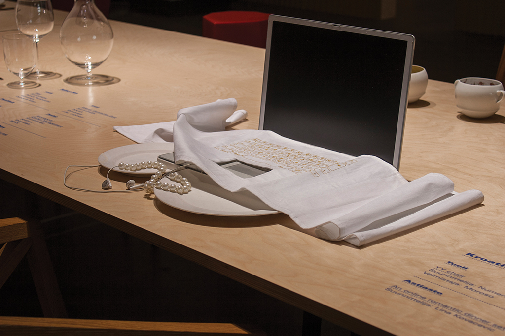 A Set For An Online Romantic Dinner consists of a half plate, corner plate, jewellery headphones, bow tie headphones, key-cloth ( so you don’t spill your wine on the keyboard ) and the rules of etiquette on how to behave during an online romantic dinner. Inspired by Berthold Brecht’s distancing objects and a 2009 Skype wedding which simultaneously took place on the airports in Dubai and London, the set and associated performance are designed for couples in long distance relationships who would like to make their online encounters significantly more romantic. The project deals with the patterns of digital communication and investigates fetishes in the virtual landscape representing critical artefacts of the media landscape that we inhabit. It is the result of a research for an MA project at the St. Martin’s School of Art in London. The artefacts, designed as real products with subtle aesthetic, objects of desire, acting as “diegetic objects”, are commonly used in speculative projects for creating a specific atmosphere in communication and presentation of speculative scenarios